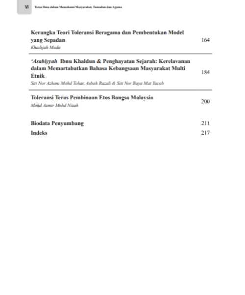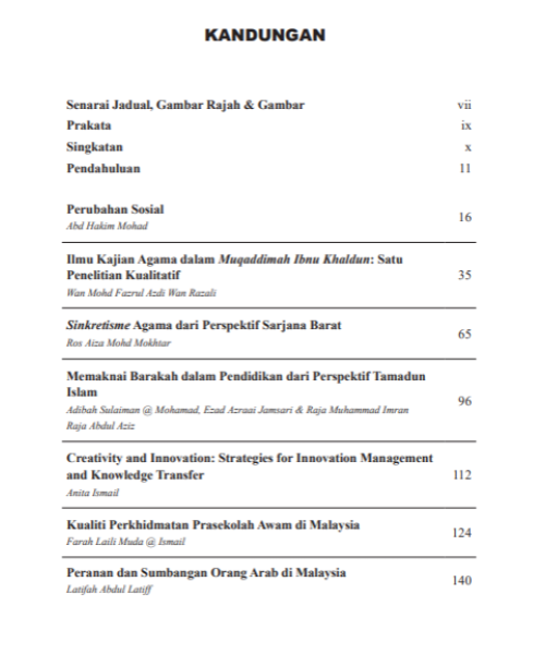 Terdapat sembilan makalah yang dimuatkan dalam buku ini. Kesemua isu yang dibincangkan dalam buku ini merupakan satu rangkuman perspektif dalam memerihalkan masyarakat, tamadun dan agama yang dilihat dari pelbagai disiplin ilmu.