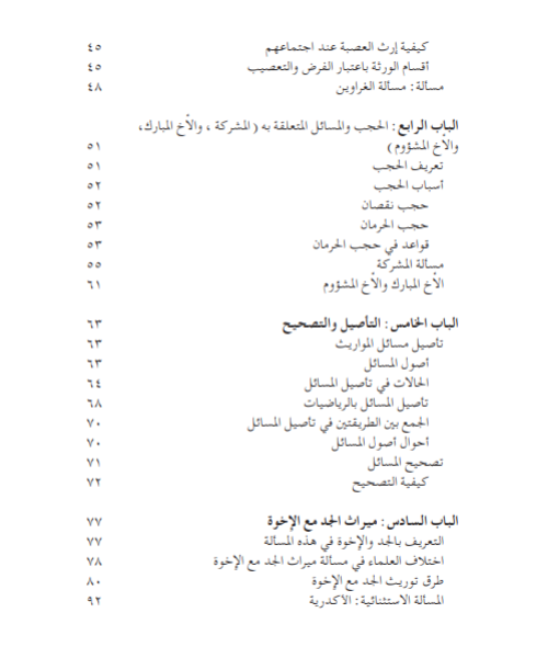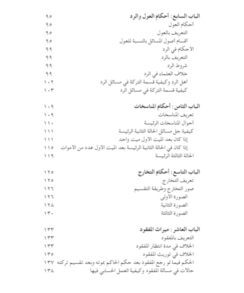 فالموضوع الأول يتناول الأحكام العامة في علم المواريث، والتركة والحقوق المتعلقة بها، والورثة والأمور المتعلقة بهم، والحجب والمسائل المتعلقة به، والتأصيل والتصحيح، وميراث الجد مع الإخوة، وأحكام العول والرد، وأحكام المناسخات، والتخارج، وميراث المفقود