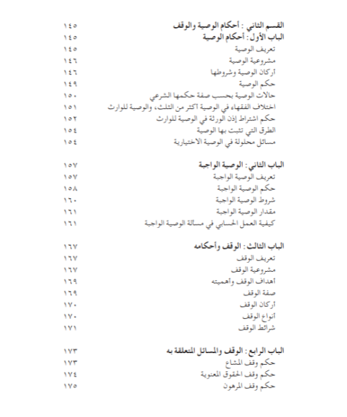 وأما الموضوع الثاني فيتطرق إلى مناقشة أحكام الوصية، والوصية الواجبة. فأما الثالث يتركز في بيان الوقف وأحكامه والمسائل المتعلقة به