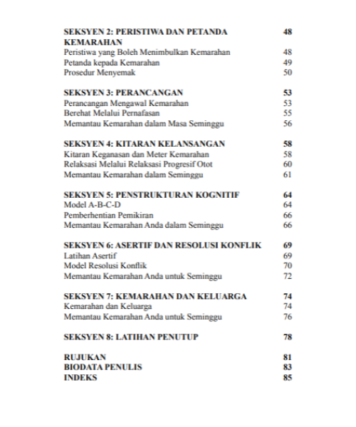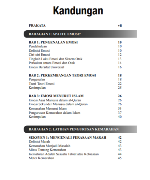 Buku ini membincangkan perkara-perkara asas tentang emosi dan pandangan Islam terhadap emosi. Manakala, bahagian kedua mengandungi latihan-latihan secara praktis yang perlu dilakukan untuk mengurus emosi marah.