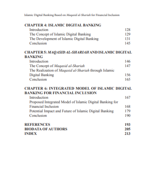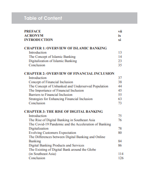 The book includes a range of topics such as overview of Islamic banking, overview of financial inclusion, the rise of digital banking, Islamic digital banking, Maqasid al-Shariah and Islamic digital banking as well as integrated model of Islamic digital banking for financial inclusion.