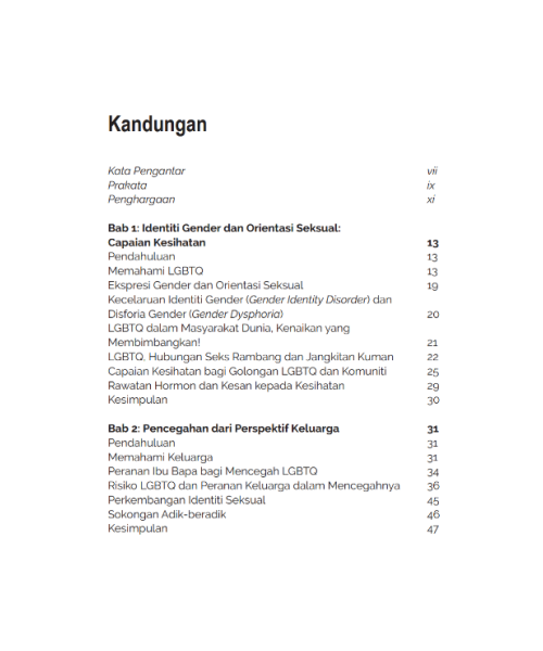 Buku ini membincangkan isu Lesbian, Gay, Biseksual, Transgender, dan Queer (LGBTQ) dan kecelaruan gender dari perspektif kesihatan, keluarga, pendidikan, kaunseling, media massa serta pencegahan awal, dengan penekanan kepada peranan keluarga dan masyarakat dalam membentuk kesejahteraan individu serta kelangsungan institusi sosial.