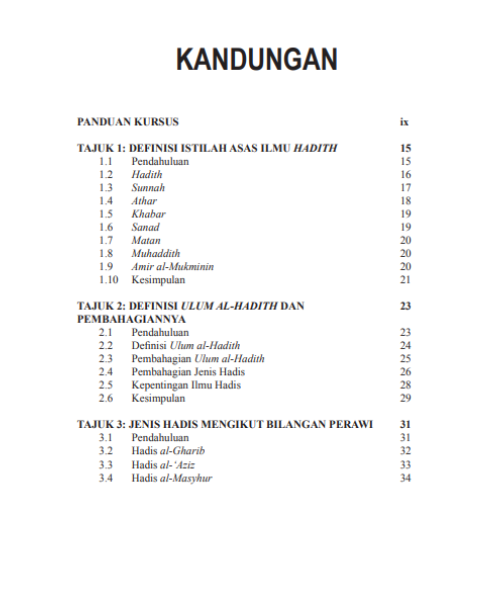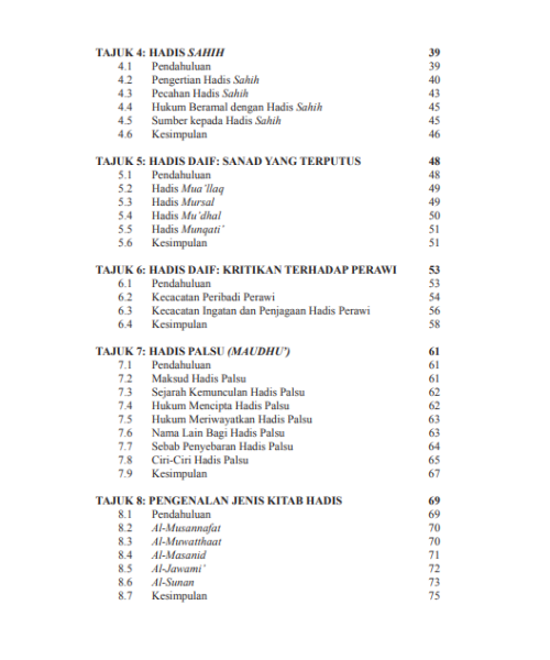 Selain itu, modul ini menjelaskan tajuk-tajuk asas dalam pengajian hadis yang merangkumi istilah-istilah asas, kitab rujukan dan metode ulama dalam karya mereka.